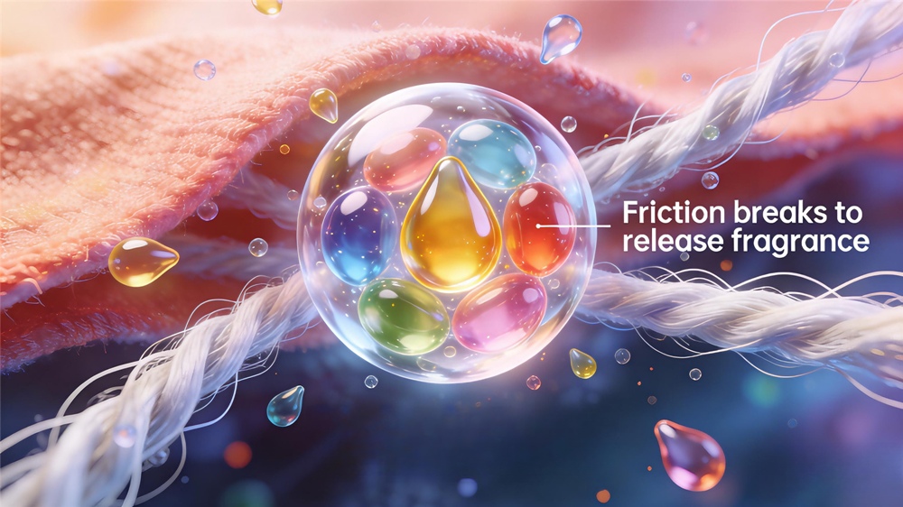• التحفيز:يعمل الاحتكاك الناتج عن الأنشطة اليومية - مثل ارتداء الملابس أو طي الملابس أو حركة الجسم - مثل "المفتاح"، مما يتسبب في انفجار الكبسولات الدقيقة مثل الفقاعات؛
