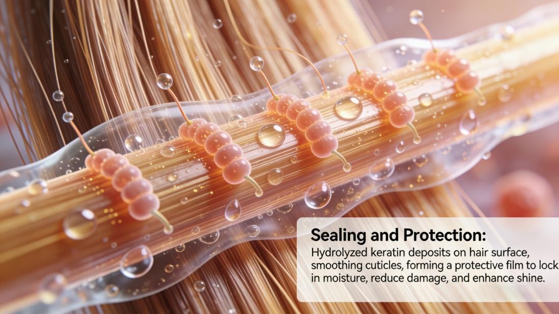 تترسب بعض رواسب الكيراتين المتحللة على سطح الشعر، مما يعمل على تنعيم البشرة المرتفعة وتشكيل طبقة واقية خفيفة الوزن تحبس الرطوبة، وتقلل من الأضرار المستقبلية، وتعزز لمعان الشعر ونعومته.