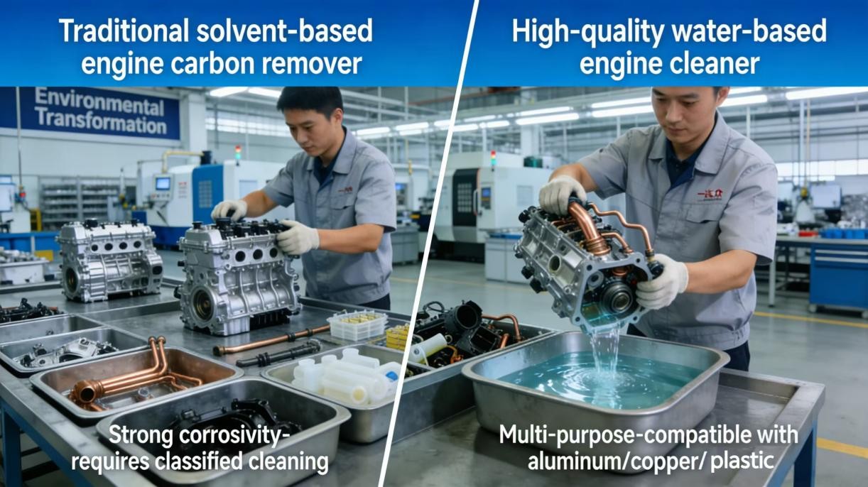 لقد أثبتت الممارسات في صناعة صيانة السيارات ضرورة التحول البيئي. تنص ورشة عمل إعادة تصنيع المحركات FAW-Volkswagen بشكل صريح على أن عوامل التنظيف يجب أن تكون متوافقة مع مواد متعددة بما في ذلك الألومنيوم والنحاس والبلاستيك، مع الحد الأقصى الصارم لبقايا الشوائب بعد التنظيف عند 10 ملجم. تتطلب مزيلات شحوم المحرك التقليدية القائمة على المذيبات، والتي يعوقها تآكلها الشديد، تنظيفًا خاصًا بمواد معينة، مما يؤدي إلى كفاءة تشغيلية سيئة للغاية. وفي تناقض صارخ، تحقق منظفات المحركات المتميزة المعتمدة على الماء "منتجًا واحدًا متعدد الاستخدامات" من خلال تركيبات مصممة علميًا، مما يحقق توازنًا مثاليًا بين فعالية التنظيف وسلامة التطبيق.